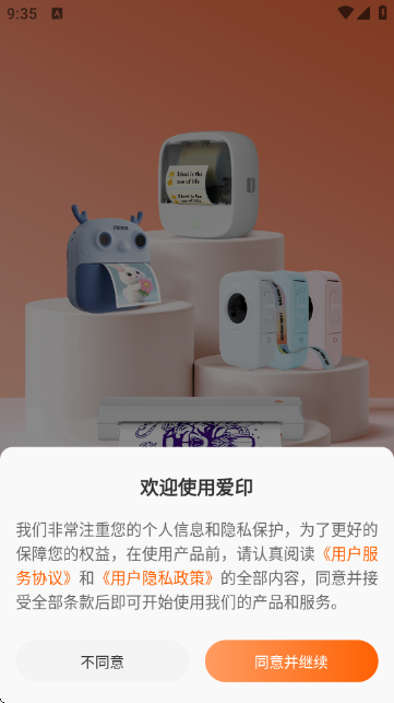 1.下载安装“爱印打印机”APP后,打开应用,在欢迎页面点击【同意并继续】,进入主界面。