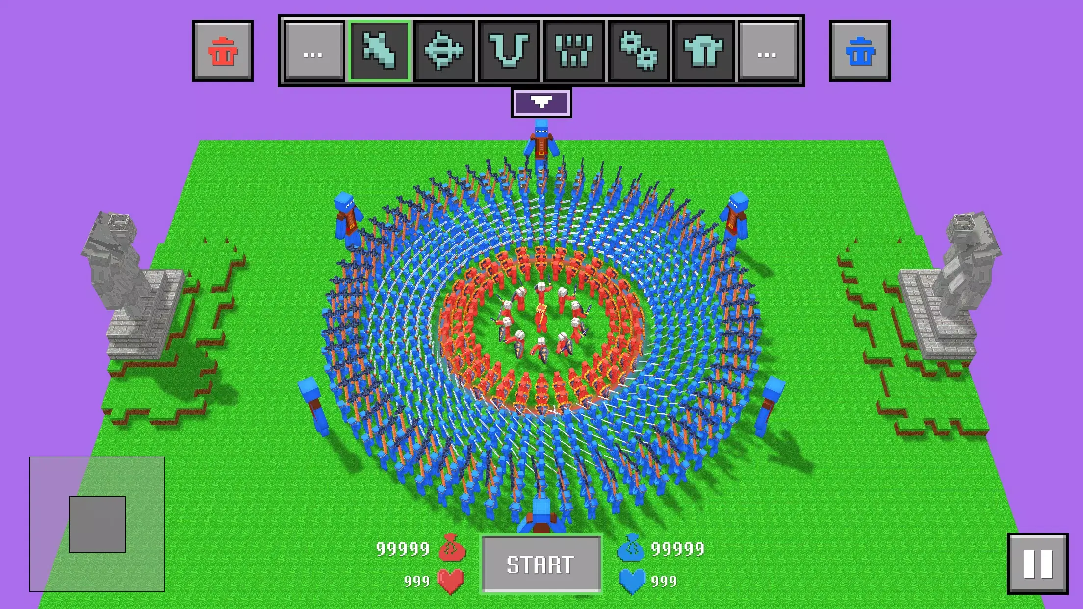 布娃娃战争模拟器是一款充满趣味的战斗模拟游戏,让你亲手创建大规模的战术对决,看着那些方块状的布娃娃角色在独特的物理规则下展开滑稽的争斗,成为红蓝阵营的指挥者,只需选择你的部队并将他们放置到战场上,就能开启一场混乱又欢乐的模拟,你可以不断调整和强化自己的军队阵容,观察那些基于物理引擎产生的搞笑动作和碰撞效果,发现拥有不同能力与夸张表情的各类兵种,他们的战斗姿态、发出的古怪声响以及相互扭打的场面,总能带来意想不到的欢乐。