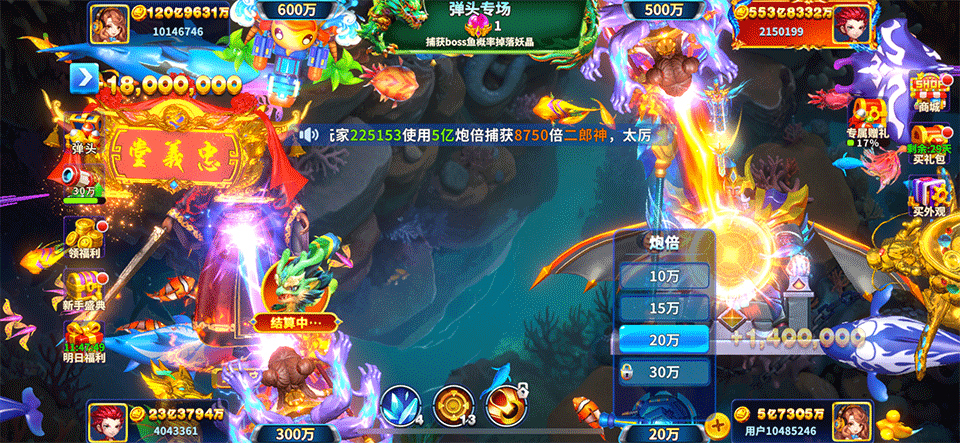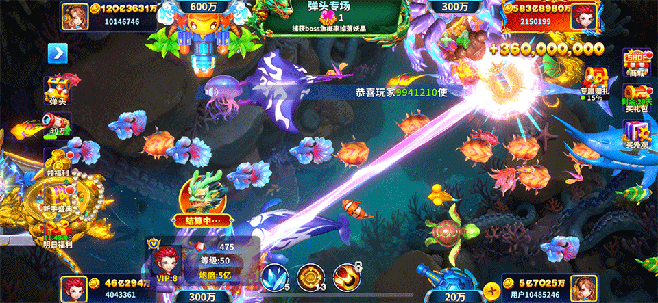 3.玩家可以捕获各种海洋生物,并使用道具增加捕鱼成功率,想要获得更高倍数的话,需要开启更高级的炮台,可以通过购买或参与活动来获得。