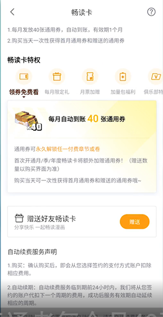 开通畅读卡后,用户每月可获得40张通用券,这些通用券可直接用于解锁付费漫画章节。通用券解锁的漫画内容将永久有效,用户可随时回看。此外,畅读卡还提供章节订阅专属折扣、用户等级加速提升权益以及每月额外赠送的月票,月票可用于支持喜爱的漫画作品。