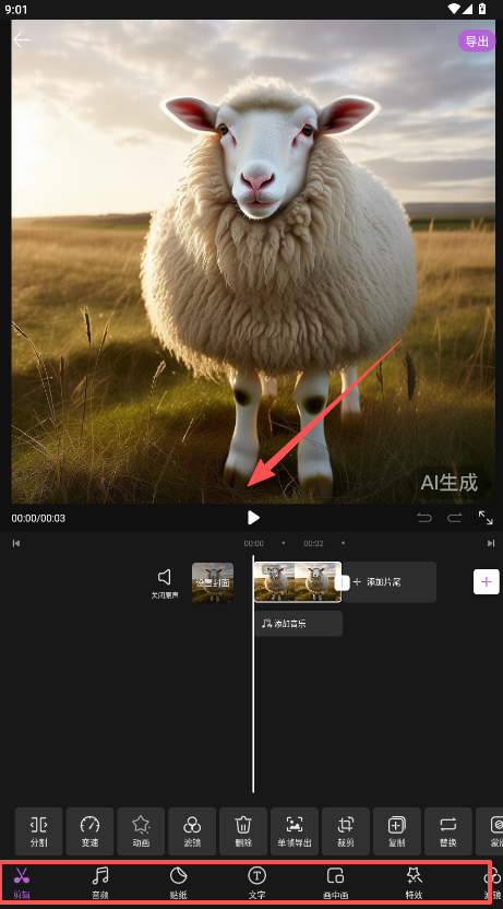 4、像使用美图秀秀等编辑工具那样,对它的整体效果进行编辑制作,包括剪辑效果以及各项成片效果预览等。