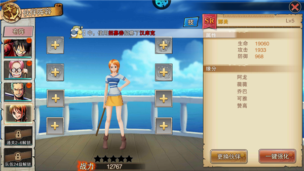 伟大航路阵容:由路飞、布鲁克、甚平、罗宾、索隆组成。路飞作为主角,拥有强大的攻击力和生命值,是阵容中的核心输出;布鲁克擅长速度和暴击;甚平具备强大的防御和控制能力;罗宾可以降低敌人防御,增强己方输出;索隆则是一个重要的输出点。