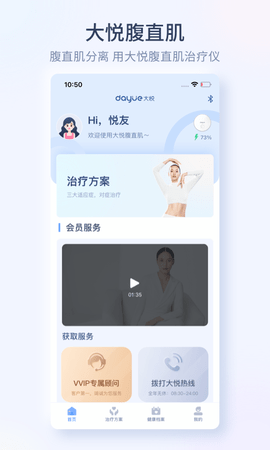 大悦腹直肌是一款工具辅助软件,它提供了三大适应症的治疗方案,可以对症治疗。这款应用需要搭配大悦腹直肌治疗仪一起使用,并具备首页、我的、治疗方案、健康档案等多个功能。用户还可以通过使用指南来学习如何正确地使用大悦腹直肌治疗仪,以确保治疗的安全和更好性。用户还可以享受会员服务提供的特权,获得更好的使用体验。