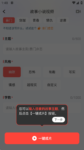 4、然后您可以输入想要的故事主题,然后点击[一键成片]按钮。