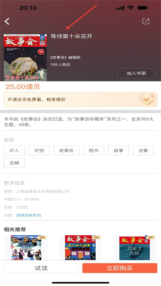 4、图书详情板块,以《等待第十朵花开》为例,它属于珍藏本系列,包含6大主题共48册,页面会标注书籍详细信息,并支持试读和立即购买操作;
