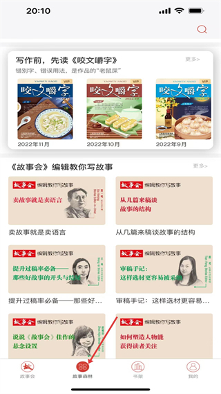 2、故事森林板块,这里展示了咬文嚼字杂志,还有编辑教写故事的专栏,内容涵盖故事语言技巧、故事结构分析以及过稿技巧等写作指导;