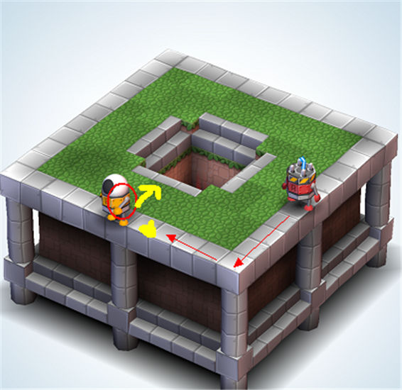 1、将小黄人移动到图中圈圈处,等待小红人沿箭头方向自动到来
