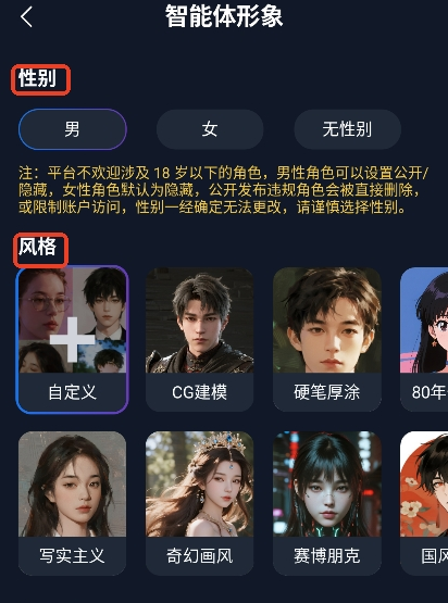 2、选择您想要的智能体性别,以及人物外貌的风格;