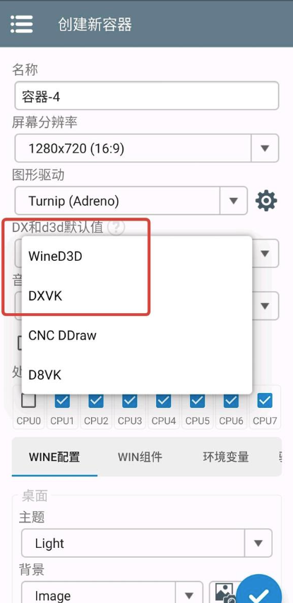 图形接口:骁龙处理器选择“DXVK”,其他处理器选择“wineD3D”。
