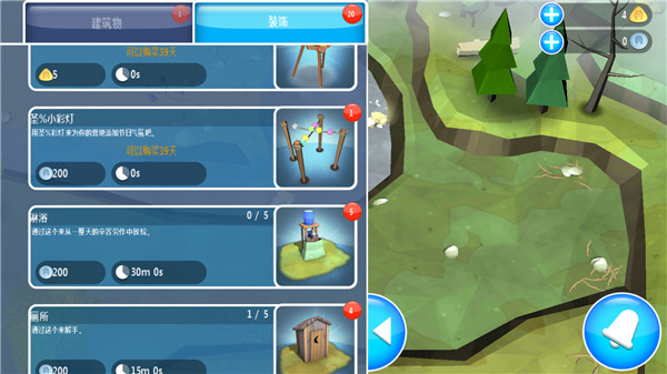 1、游戏核心玩法围绕建筑与资源采集展开,建筑物分为装饰性与实用性两类,其中装饰性建筑可出售换取资源。