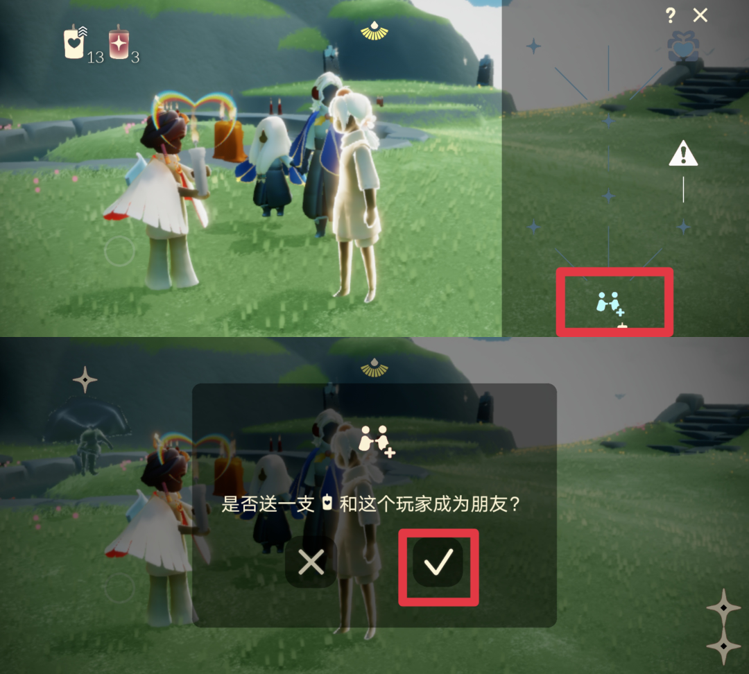 成为好友后,可以牵手、背背,还能用蜡烛解锁好友树,获得如拥抱、击掌等动作。