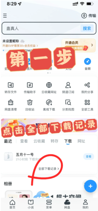 1,打开uc浏览器app,点击网盘进入,然后点击全部下载记录;