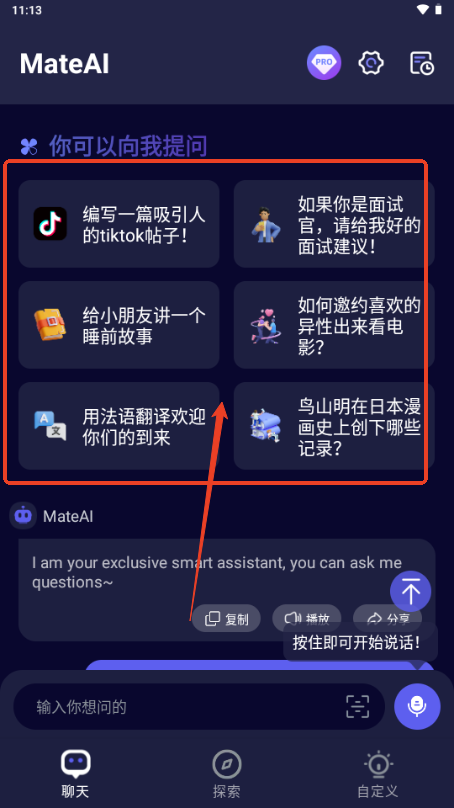 MateAI软件围绕自然语言交互展开,向用户提供智能文本生成与知识问答服务。用户可通过输入关键词或描述性语句,让软件自动生成文章大纲、邮件内容、创意故事等不同类型的文本。软件整合了广泛的知识库,能够回答科学、历史、文化等领域的常识性问题,并提供步骤清晰的实用指南。其对话系统具备记忆上下文的能力,在长对话中保持话题一致性,还可根据用户反馈优化回答内容。此外,软件还提供代码编写辅助、简单翻译、数据整理等专业化工具性功能。