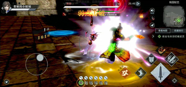 第四阶段,大战关羽。这个首领战场景与对战张飞时差不多,同样有两个光圈,但关羽的强度明显强过张飞,拥有大量的连击技能,攻势更为迅猛。首领战4分钟后进入狂暴状态。