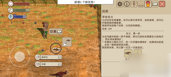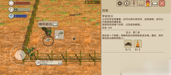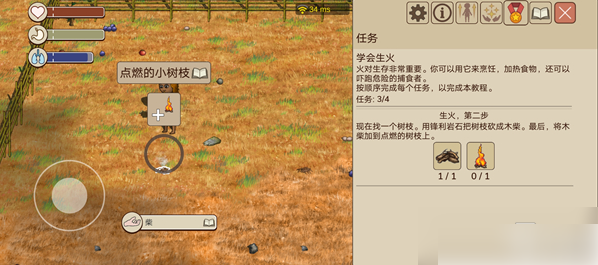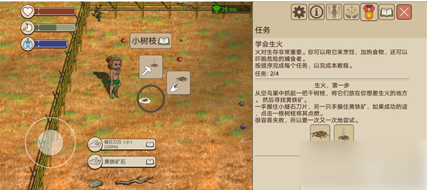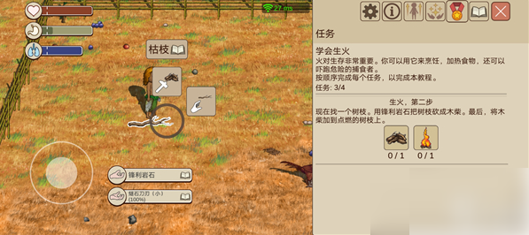 2、点燃干树枝:拾取地上的黄铁矿,手持燧石刀刃、黄铁矿,对着干树枝交互,即可点燃干树枝,该步骤容易失败,需要一次次尝试;