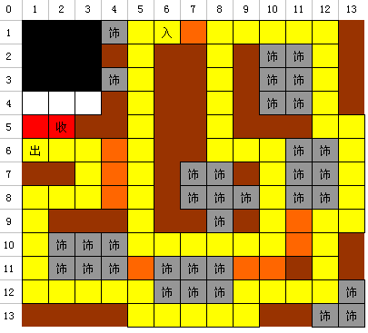 用法与移动图标一样,点击一下则所点货架(可装饰品)会顺时针旋转90度。以上是一些控件的基本功能,下面会说说路径的问题。所谓路径就是进口和收银台之间的一条连续的通道。系统即使在您装潢过程中也会检测这条通道的完整性,系统会自动计算一条最近(距离最短)的一条通道供您参考。您可以借助这些信息来完成路径的设置,(如果你觉得系统给的路径不是你想要的,就移动货架堵住显示的通道的任意一点,这时系统会有两种反应:1、提示没有一条完整的路径能让顾客从进口走自收银台;2、系统依据您所现有的布置重新显示一条路径供您参考。)当然我们最终会通过自己不断的修改来获得我们想要的(系统也能接受的)的路径。路径有了,再看看各货架有没有感叹号