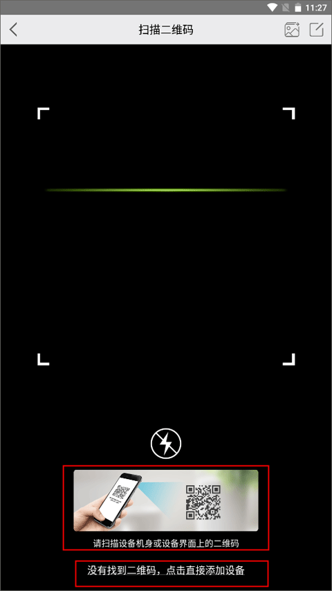 2、将手机扫描框对准设备二维码,若无二维码可点击"直接添加设备"。
