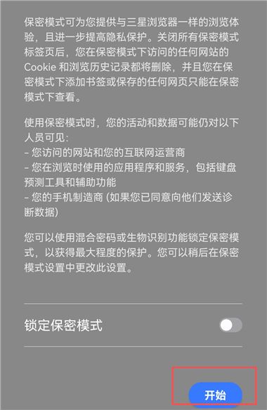 3、点击【开始】即可开启无痕模式/保密模式。