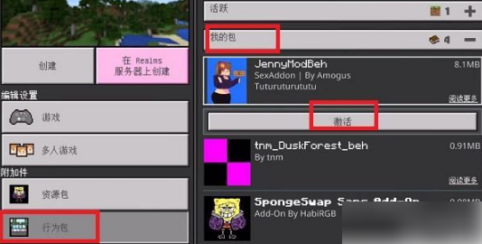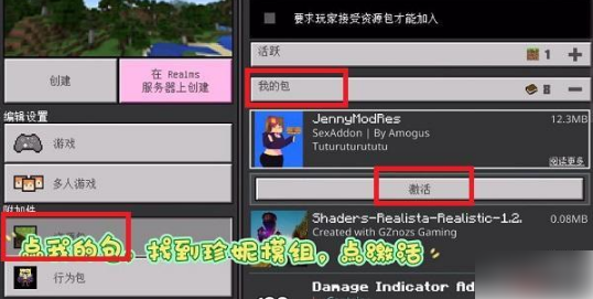 6、最后只需要在【行为包】中,打开【我的包】-【珍妮模组】-【激活】就可以完成操作进入到游戏世界中进行体验;