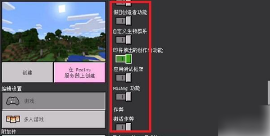 4、导入完成之后,我们进入到游戏中,选择创建世界,世界属性选择【创造】,然后【打开所有的实验性功能】;