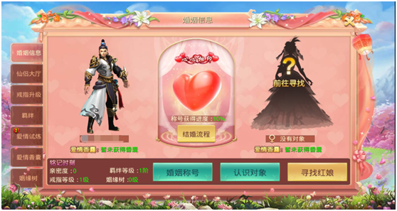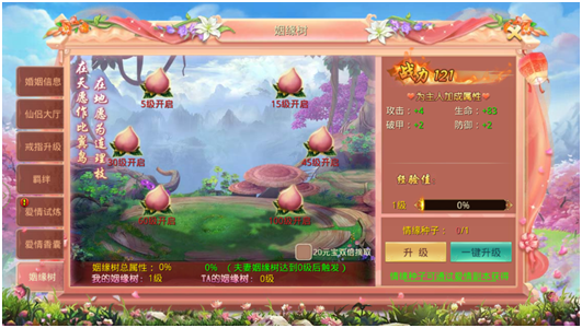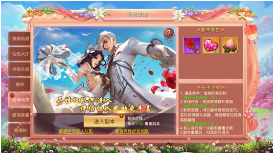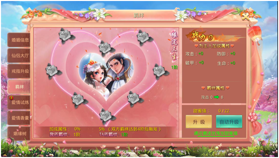 甜蜜值还可以用来升级姻缘羁绊哦,即使已结为姻缘,也不要忘了一起组队打爱情试炼副本,唠嗑唠嗑也好哈哈哈。其次,爱情试炼副本产出的材料还可以用来提升戒指、姻缘树等级、,助少侠战力更上一层楼