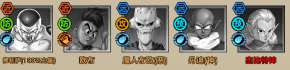 2、弗利萨(100%力量)+魔人布欧(恶)+丹迪(神)+杰比特神