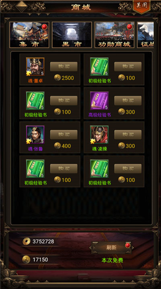 3、功勋商店:前期买将魂,把关羽尽快买出来并升星升天赋,前期很实用;还有多余的功勋可以买经验书、材料包,还可以去名将阁兑换武将