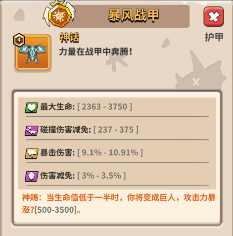 【风暴战甲】生命值低于某个数值时候可以提升攻击力,前期怪物攻击不算特别高节奏较慢血量可以控制算是不错的装备。但是在后期太被动半血发挥作用的装备基本上都没什么用,加上解锁赛季有其他更好的装备选择~~