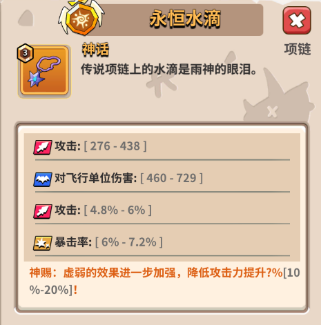 【永恒水滴】雨神是最受勇士们最喜爱的神明之一,而水滴的神赐效果则可以直接百分比增强雨神的虚弱~没有【疯狂项链】之前都可以用水滴甚至未来可以将它进行远古铸造哦~~~