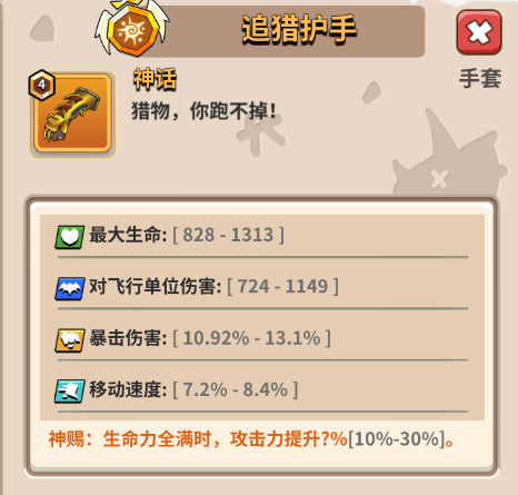 【追猎护手】生命值全满可以发挥出不错的攻击加成效果~前期值得推荐!!