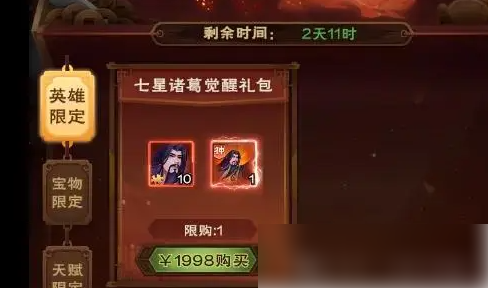 七星诸葛的觉醒卡可以在限购礼包中找到,售价为1998,但请注意,这个费用不计入累计充值活动。