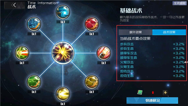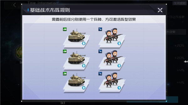 除了普通的前排肉盾,后排输出的布阵以外,当司令部等级达到12级会解锁【战术】布阵,根据不同战术布阵规则进行阵型激活,会有额外的属性加成。