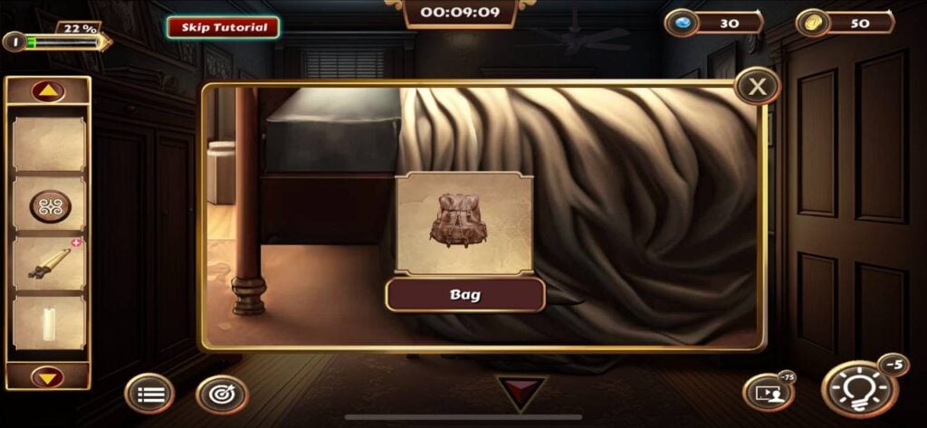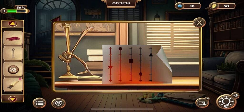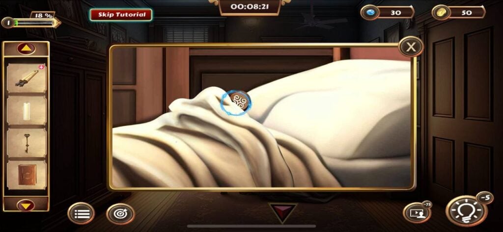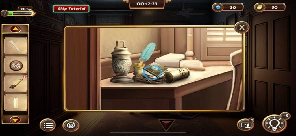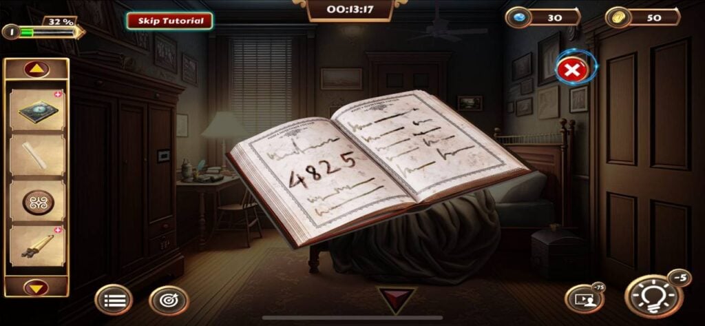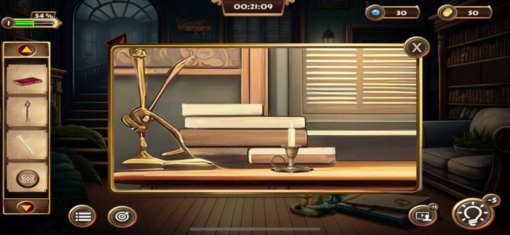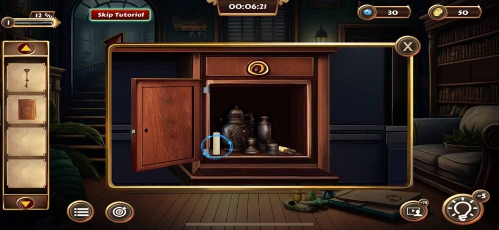 道具栏中的物品可以组合使用,例如将找到的蜡烛与烛台、火柴进行组合,才能照亮线索纸显现出隐藏信息。