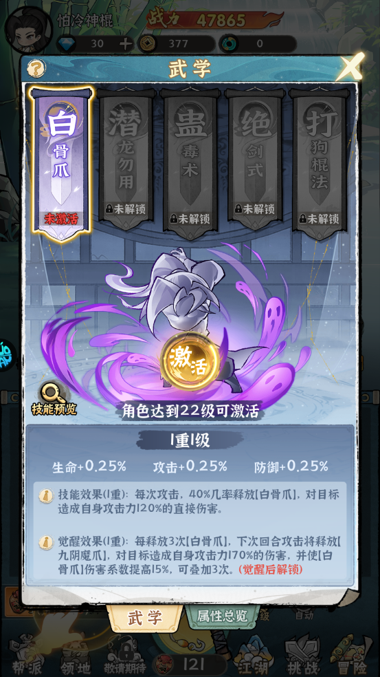 通过境界突破提升等级上限,22级解锁武学系统,可学习白骨爪、潜龙勿用等武学招式。