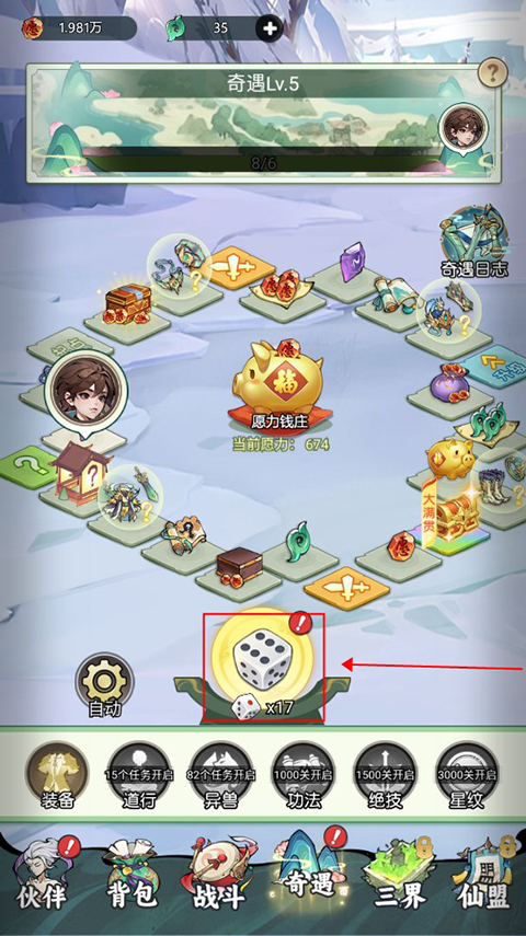 5、通过闯关、奇遇等,可以收集愿力石,用来提升主角和伙伴的等级,进一步增加队伍战力。