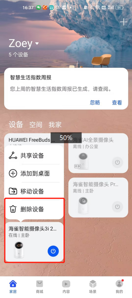 方式一:进入绑定者的智慧生活App首页,找到要解绑设备小卡片并长按,点击删除设备即可与设备解绑。