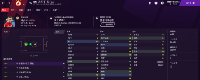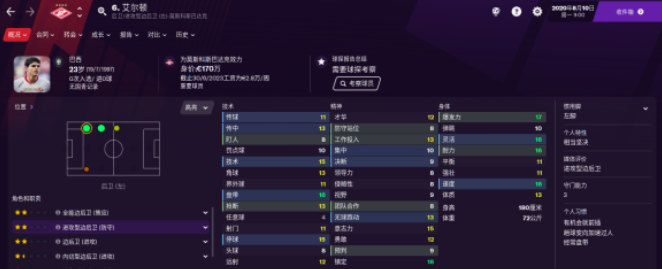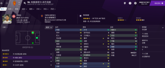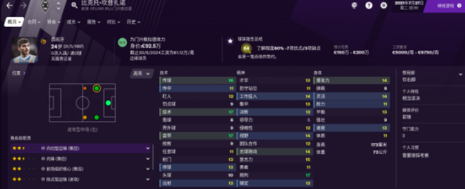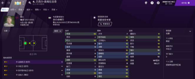这是一个有着边锋属性的边后卫,速度快的一批,技术也比较OK,适合作为进攻型的边后卫,或者直接改练边锋!但开档价格较贵,而且俄超工资普遍虚高,所以小球队别摸。