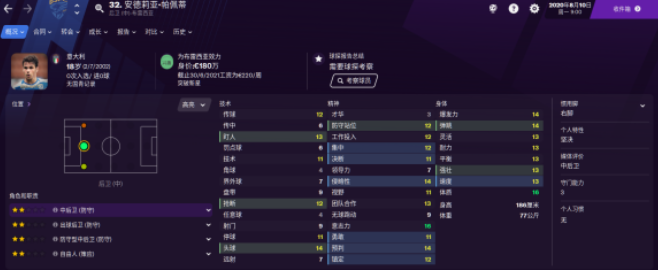 18岁的中后卫,各项属性都非常不错,但身体属性较弱,潜力很高值得培养。