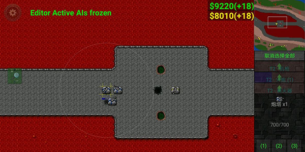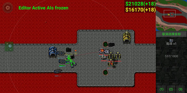 6、使用激光坦克(图片情况是假的),因沙盒模式原因很难模拟正常情况,因为钱不够的原因四号要出激光坦克在激光防御上有极大欠缺,三号只需火炮集火激光坦克,并用建造修塔,而四号的激光坦克难有输出机会大概率白给,为减小损失回收二级陆工,三号顺利拿下中。以上为我遇到的对抗火炮的方法,均以失败告终,目前尚未遇到能对付的方法(好像只有我一个人用,那就叫雪风式火炮流好了)