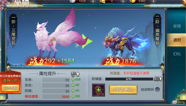 为坐骑进阶可大幅度提升其生命、攻击、防御、移动速度。