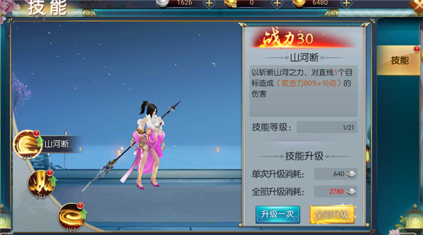 玩家可消耗银两给技能升级,增长伤害范围,提升战力。