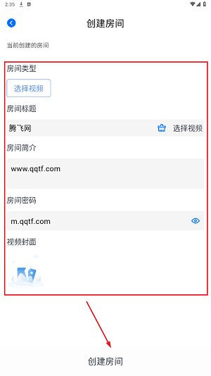 2、在创建房间界面,点击“选择视频”,挑选想要一起观看的动漫,房间简介和密码可以根据个人喜好设置,完成后再次点击“创建房间”。