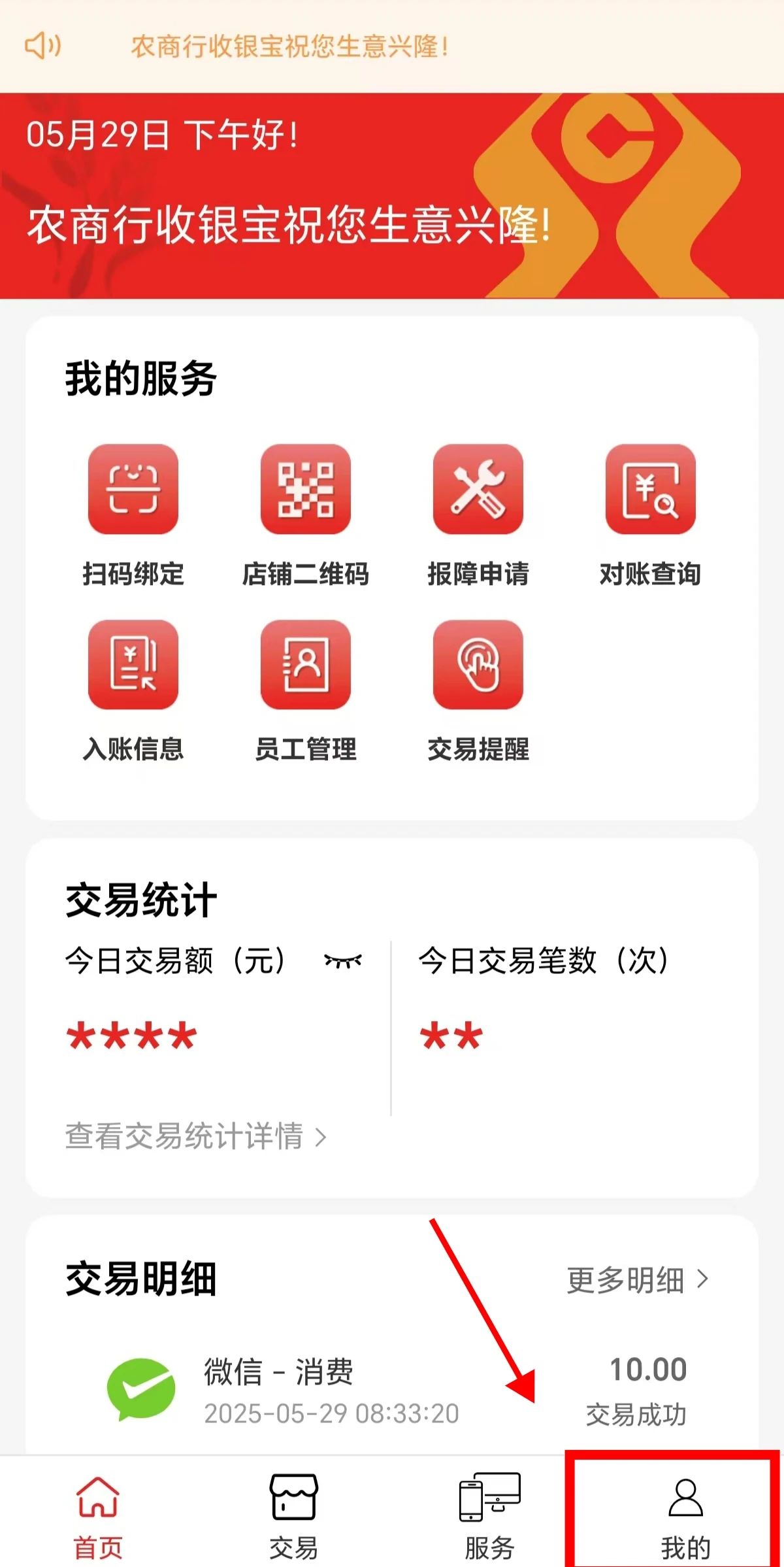 1、打开农商行收银宝App点击右下方【我的】