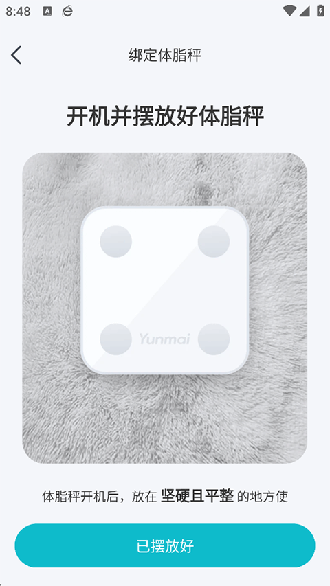 4、依照提示将体脂秤开机并摆放好,完成后点击下方已摆放好;