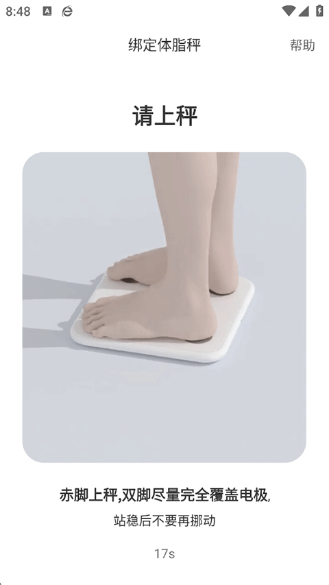 6、赤脚上秤,双脚尽量完全覆盖电极,站稳后不要再进行移动,等待大约20秒连接。