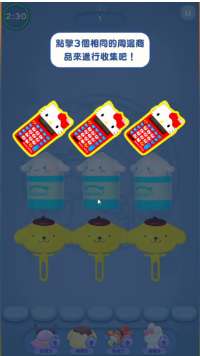 在关卡倒计时内,从杂乱堆积的周边山中快速找出三个同款商品并点击完成配对。