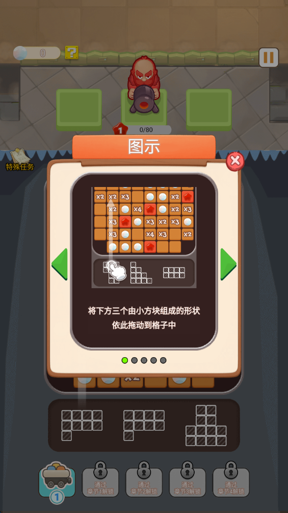 1.打开游戏之后会有一段新手教程,将下方三个由小方块组成的形状依此拖动到格子中。