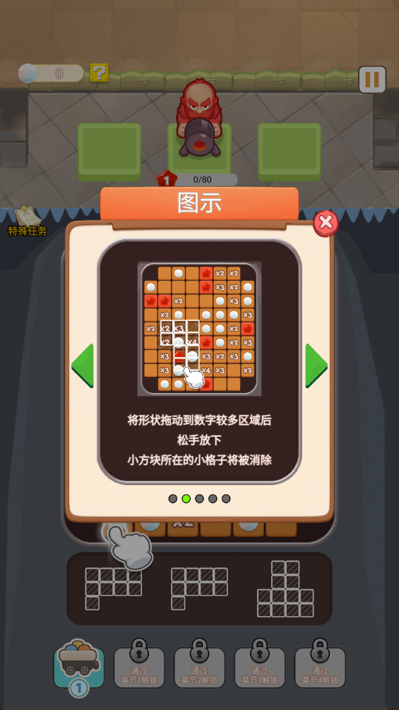 2.将形状拖动到数字较多区域后松手放下,小方块所在的小格子将被消除。