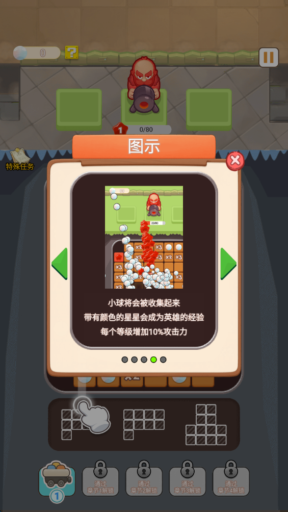 4.小球将会被收集起来,带有颜色的星星会成为英雄的经验,每个等级增加10%攻击力。