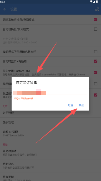 6、输入自定义ID确保内容没有空格点击提交,订阅ID在蓝岛论坛中即代表串。